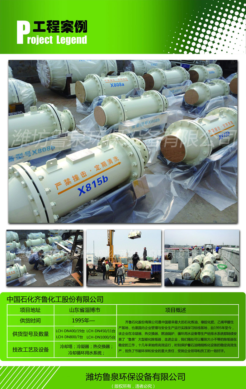 齊魯石化股份有限公司是中國石化煉油、橡膠化肥、乙烯甲醇生產(chǎn)基地,也是國內(nèi)企業(yè)管理與安全生產(chǎn)運(yùn)行實(shí)踐學(xué)習(xí)標(biāo)榜基地,自1995年至今,該企業(yè)在冷凝器、熱交換器、燃油鍋爐、循環(huán)用水設(shè)備等生產(chǎn)給排水系統(tǒng)都陸續(xù)安裝了“魯泉”大型磁化除垢器,走進(jìn)企業(yè),我們隨處可以看到大小不等的除垢器在穩(wěn)定的工作,十幾年來始終高效運(yùn)行,時(shí)刻保護(hù)著石油精細(xì)煉化設(shè)備的穩(wěn)定高效生產(chǎn),擔(dān)負(fù)了節(jié)能環(huán)保和安全的重大責(zé)任,受到企業(yè)領(lǐng)導(dǎo)和員工的一致好評。