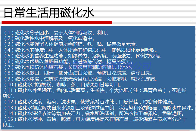 6:磁化水具有充分滅菌功效,抑制細(xì)菌繁殖生長(zhǎng),杜絕細(xì)菌的交叉感染。